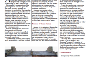 Council Review speaks to Padraic Grennan speaks about the probate genealogy research services being provided to local authorities across Ireland. Establishing ownership of vacant homes can be a complicated issue for council housing staff. In many cases, extensive genealogy research is required to identify and trace that person or their next-of-kin. This probate genealogy service is particularly useful to vacant homes officers. As part of the Compulsory Purchase Order process, owners can be identified and located at an early stage. This eliminates any complications at a later date should a property be acquired. Erin Research has extended its probate genealogy service offering to assist councils in this regard.
